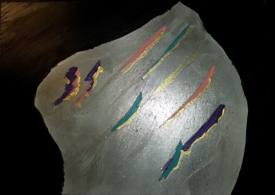 I still enjoy how the colors came out. I love a fiery yet bruised sky and a sea of gold at sunset. I have some other seaside/ocean-themed pieces that I’m working on. The running theme behind most of them is I like to play with colors and make familiar ocean scenes more fantastic. I love a purple cliffline and lavender ocean. Maybe it’s because I grew up on an island. I love my home but I hate how other people just paint the same thing: powdery sand, cerulean blue ocean, a sun rising or setting over the horizon, and a palm tree thrown in for good measure.