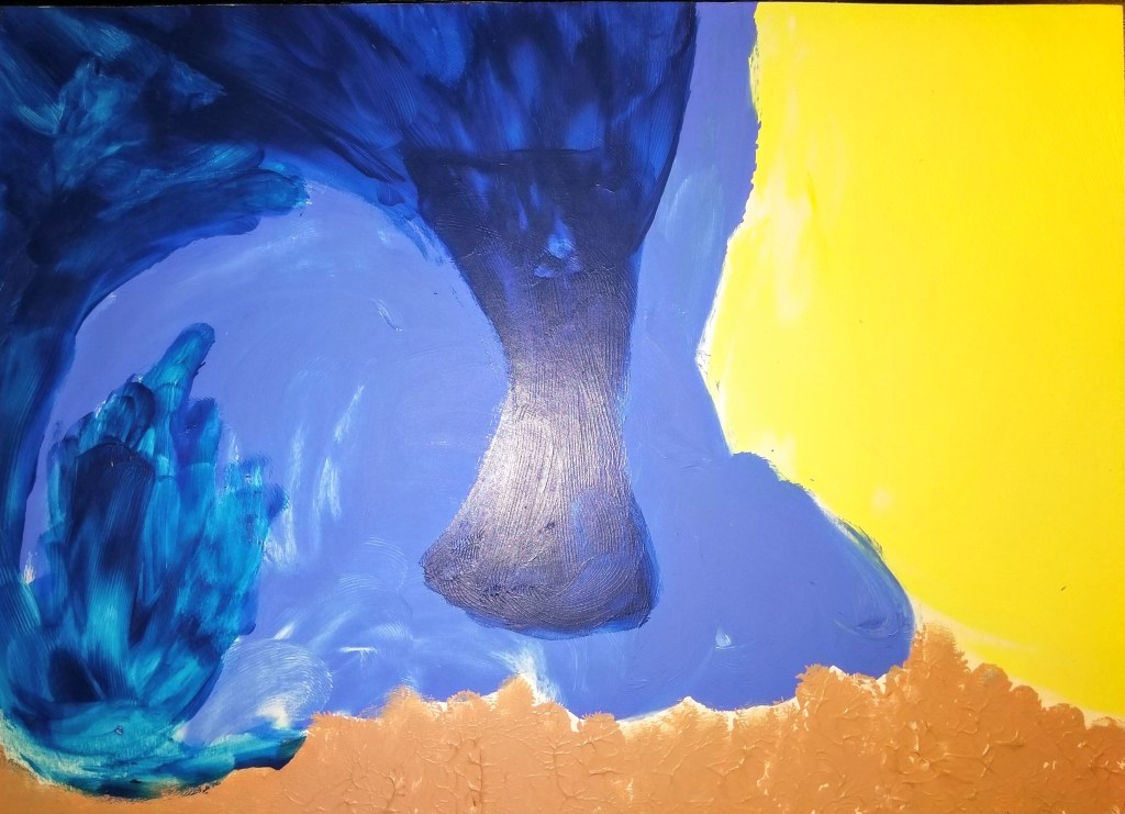 I don’t have a better title for this. I had no theme or goals when I painted except to rid myself of some excess emotions and energy. I like how the stucco-y texture from the light, peachy brown (a color that the paint tube says is “burnt sienna” but having never seen a sienna, either burnt or just right, I can’t find it in me to call it that) comes through. I like how the blue swirls and dips and ignites in some places. I like how I ran out of steam 3/4 of the way through this painting and filled in the empty space with yellow.